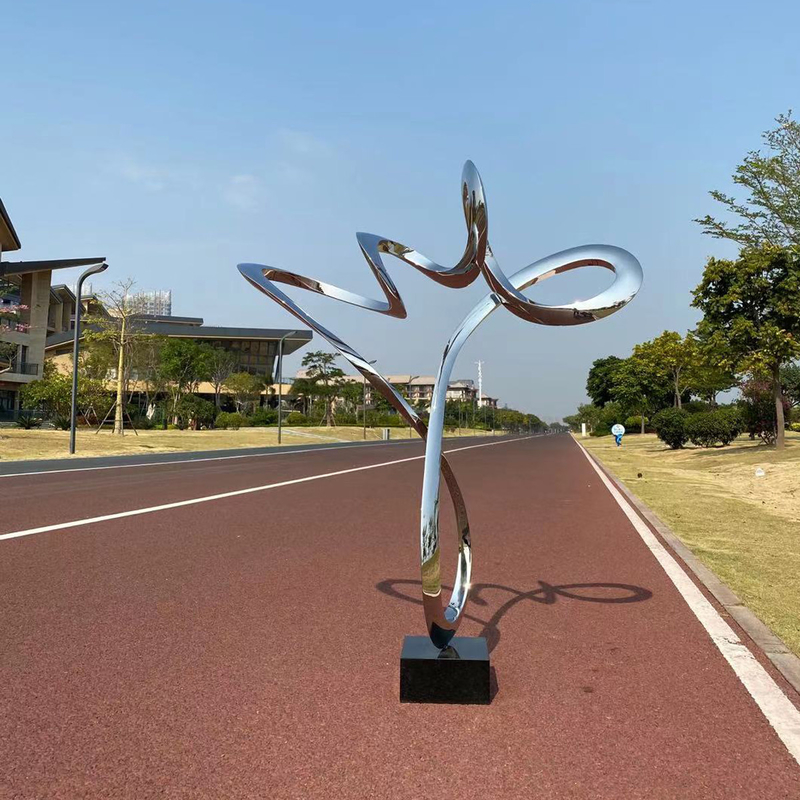 デザイン と スタイル: 磨き上げ られ た ステンレス スチール で 作ら れ た リボン の デザイン は,動き と 流動感 を 作り出し,あなたの 装飾 に 現代 的 で 芸術 的 な 要素 を 添え ます.ステンレス スチール の 滑らかで 反射 的 な 表面 は,彫刻 の 視覚 的 な 魅力 を 強化 する黒い石のベースは 安定した対照的な基盤を 彫刻に提供しています