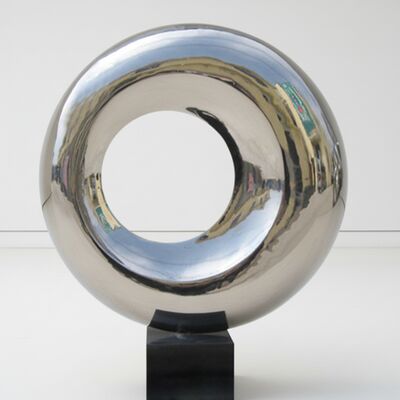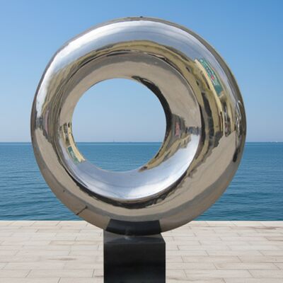 このステンレス鋼の現代美術品は,光と周囲を捕捉する 高光輝く鏡面を特徴とし,抽象的な円形をあらゆる現代空間のための動的な焦点に変えます.