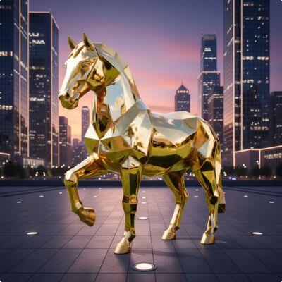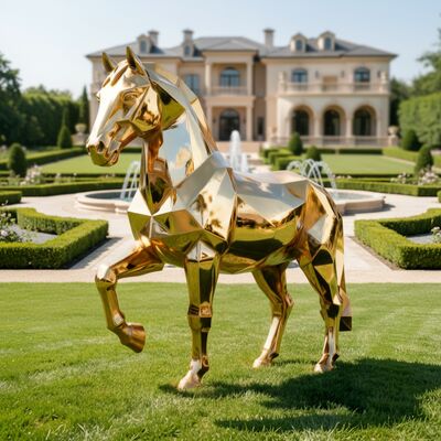 This striking golden horse sculpture redefines equine artistry through a bold geometric lens. Crafted from polished metal, its angular, faceted form transforms the classic horse silhouette into a modern masterpiece, with each plane reflecting light to create a dynamic, shimmering effect.
