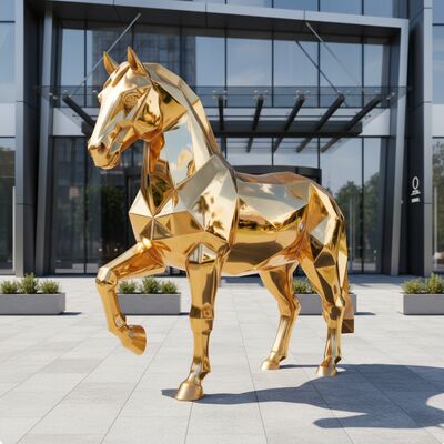 Standing proudly in a manicured garden or urban plaza, the sculpture’s reflective gold surface mirrors its surroundings—be it lush greenery, stately architecture, or city skylines—blending nature and design in a single, eye-catching statement. More than a decorative piece, it symbolizes strength, elegance, and the fusion of traditional symbolism with contemporary aesthetics, making it a perfect focal point for public spaces, luxury estates, or cultural landmarks.